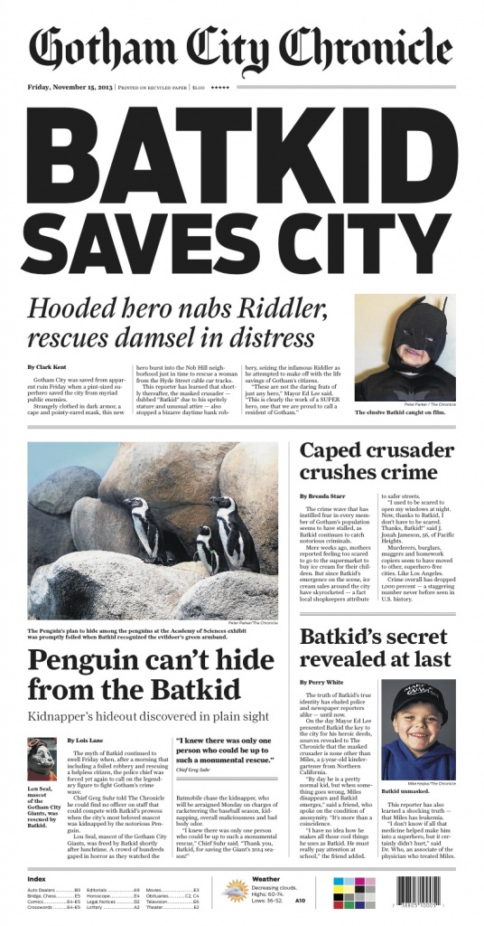 Ucapan Bruce Wayne ini memang benar adanya: siapapun bisa menjadi Batman. Salah satunya datang dari San Fransisco, Amerika Serikat. Adalah Miles Scott, seorang penderita penyakit leukimia, yang dikabulkan permintaannya oleh sebuah badan amal Make-A-Wish. Bukan untuk bertemu pemeran Batman, ternyata bocah lima tahun ini berangan-angan untuk menjadi sang ksatria malam. Maka dari itu, mendekati akhir dari masa penyembuhannya, SanFransisco Make-A-Wish mengabulkan keinginan tersebut, apalagi impiannya diikuti denga petisi yang disetujui banyak orang. Kota San Fransisco pun disulap menjadi Gotham City dalam satu hari pada 15 November 2013.