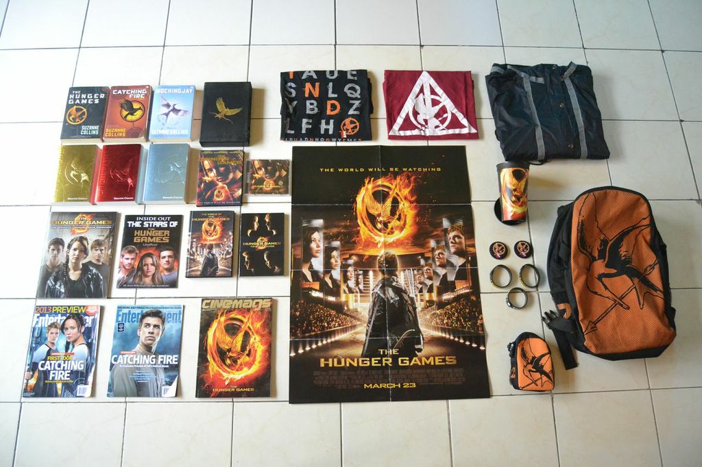 Nah, bagaimana dengan merchandise The Hunger Games, atau istilah jelatanya ‘kenang-kenangan’, yang sudah dikoleksi para Tributes? “Di antara Gamemakers IHG, yang paling lengkap dan niat banget koleksinya itu Mudita. Selain buku Trilogi THG yang lengkap, dia juga mengoleksi movie tie-in dan buku THG-related seperti Tributes Guide, The World of The Hunger Games, bertumpuk majalah yang berhubungan dengan THG, DVD, soundtrack, kaos, pin Mockingjay, sampai original merchandise seperti backpack-nya Katniss.”