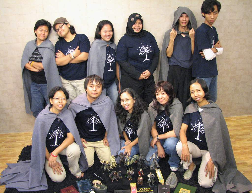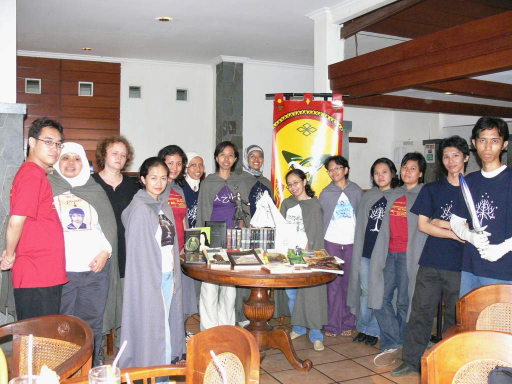Terus, siapa aja sih para penghuni Middle Earth yang cukup aktif dalam Eorlingas? “Aktivisnya yang paling sering muncul baik secara virtual maupun physical: Riri “Luthien”, Dini “Haleth”, Novia “Illyria”, Yohanna “Elwen”, Heny, Waldo “Bombur”, Kania Anggraini “Niphredil”, Budi “Frodo”, Kania Damayanti “Elanor”, Poppy “Arwen”, Diana “Raellyra Took” Hadi “Elranhir”, Tities, Ijul “Varda”, Rheeq “Legolas”, jelas Dini. Wah, semua punya nama masing-masing. Kalau Mimin, mungkin namanya Mimin “Kaki Hobbit Berbulu” (macam nama orang Indian di komik-komik Donal Bebek ya?)