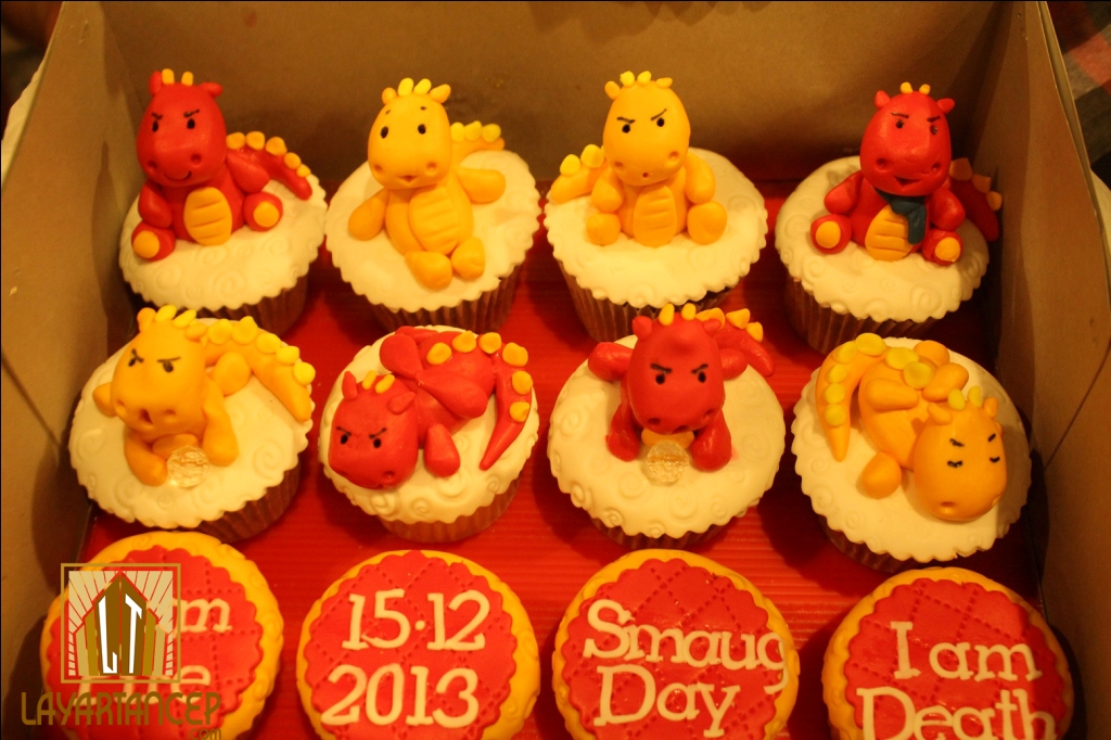 Kelar nonton, seperti biasa ada sesi foto-foto. Eh, tunggu dulu! Ternyata ada Jelata yang berulangtahun! Waaah, selamat ulang tahun Teh Anjani. Bahkan, khusus untuk nobar hari itu, doi sudah menyiapkan kejutan berupa 12 cupcake ber-topping Smaug. Lutchuuuu! Ada Smaug yang lagi tiduran, ada Smaug yang lagi menjaga Arkhenstone, bahkan karena Teh Anjani juga pencinta Benedict Cumberbatch di Sherlock ada Smaug yang pake syal ala Sherlock lho. Gemes nggak siiiih?? Para peserta yang udah dapat cupcake Smaug langsung deh berubah jadi banci foto. Segala gaya dikerahkan, mulai dari foto sama cupcake, di depan poster, tiduran, sampai ada yang kayang (eh, nggak ada deng. Itu cuma imajinasi liar mimin aja).